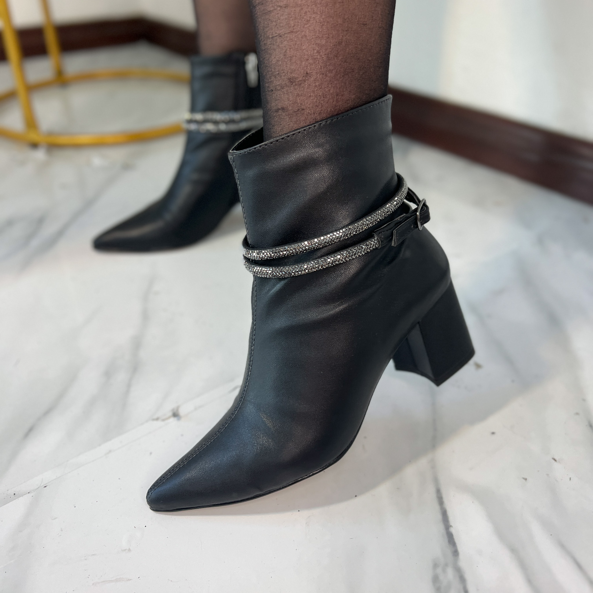 A bota coringa com cano curto, bico e salto grosso surge ainda mais irresistível nessa versão com acabamento minimalista e detalhes com a fivela de brilho. Use com vestidos que vão do midi ao míni comprimento, minissaias, jeans reto cropped, peças de alfaiataria… Seja qual for sua escolha, o resultado é sempre uma produção sofisticada e estilosa! Fivela removível.